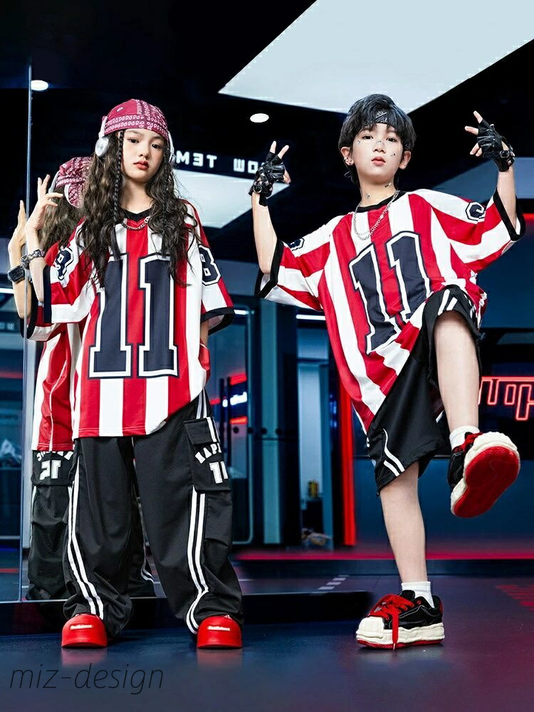 ダンス 衣装 セットアップ 白 赤 黒 ストライプ柄 バスケットボールシャツ 女の子 男の子 カッコイイ 子供服 k-pop