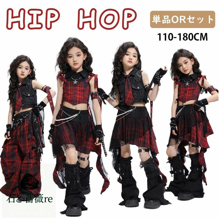 キッズ ダンス衣装 チェック柄 セットアップ 女の子 ダンス へそ出し トップス 赤 黒 ヒップホップ ズボン スカート 子供 ダンス服 ダンスウェア 韓国 Y2K チアダンス 団体服 イベ JAZZ