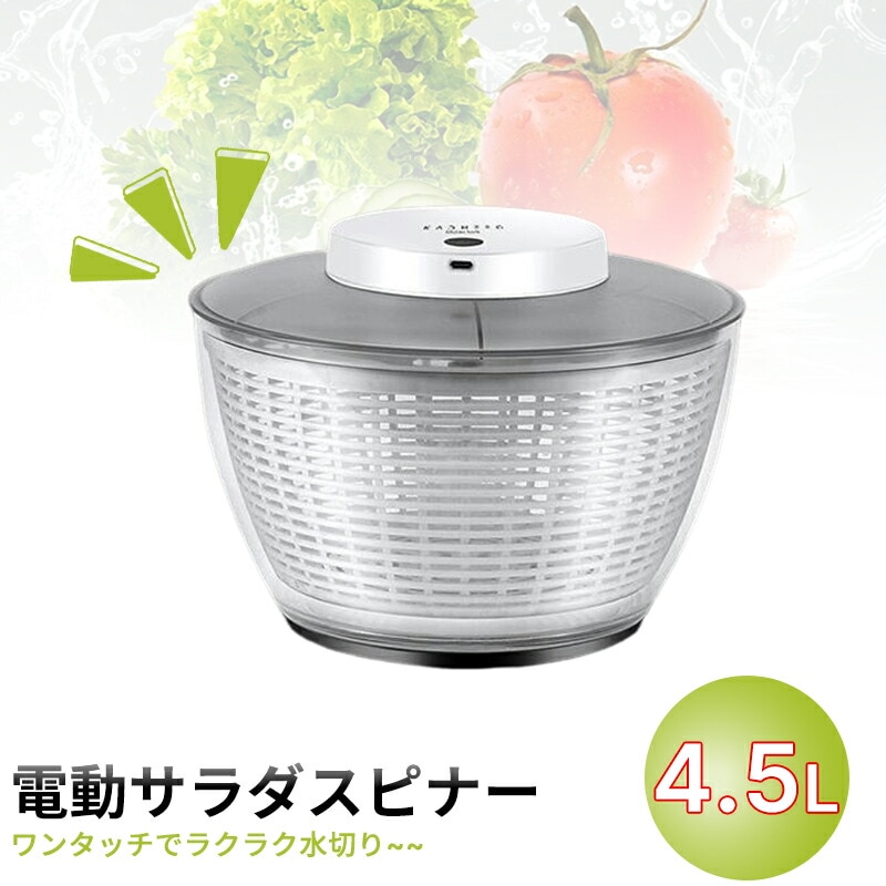 電動サラダスピナー 4.5L 大容量 野菜水切り器 電動 サラダスピナー 水切りザル 高速水切り 野菜 USB充電式 キッチンツール 調理器具 果物
