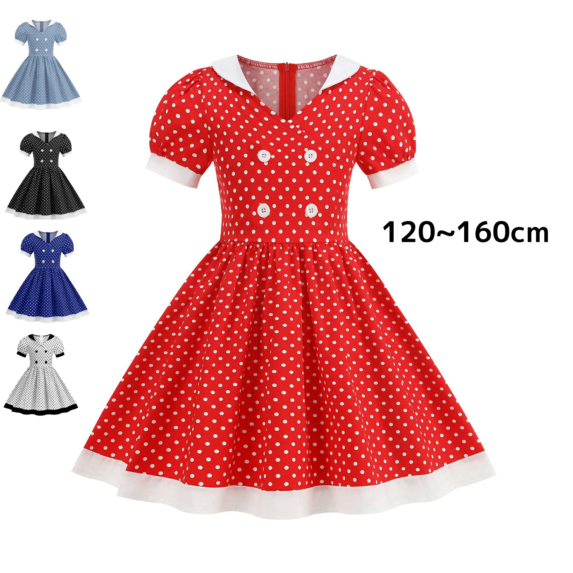 可愛い女の子ワンピース ドット柄 水玉柄 半袖ワンピース レトロドレス ヴィンテージ風 キッズ フレアワンピース ダンス衣装 社交ダンス Aライン 団体服 演出服 学園祭 文化祭 合唱 イベント衣装