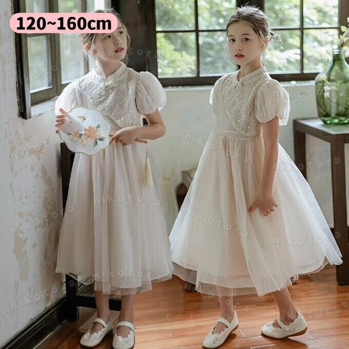 ワンピース 女の子 ドレス ロング チャイナドレス パーティードレス フォーマル ゆったり フレアワンピース Aライン チュールワンピース 韓国子供服 ガールズ 半袖 結婚式 七五三 お宮参 ジュニア