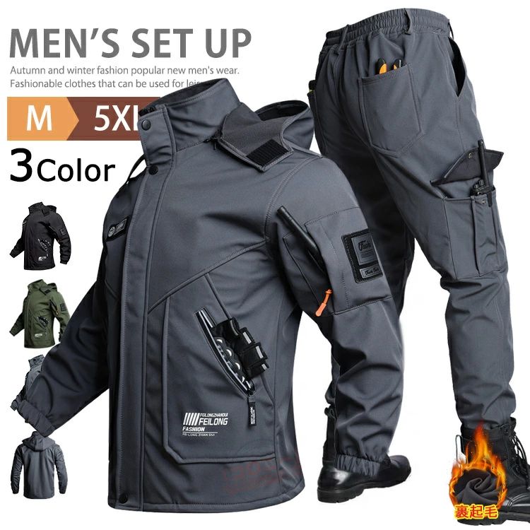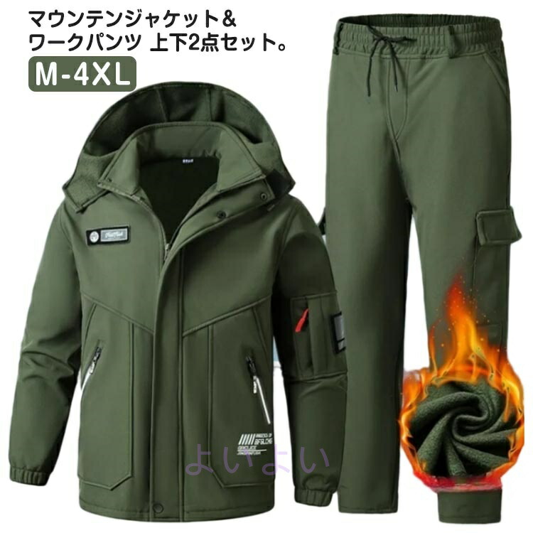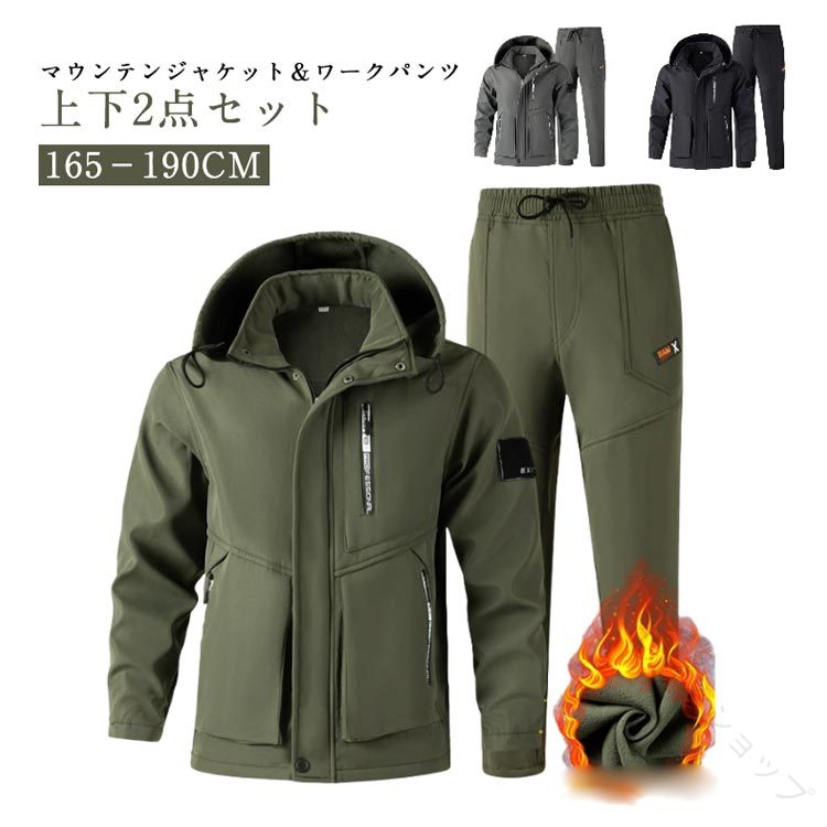 冬のアウトドアに最適 防寒防水マウンンテンジャケットセット メンズ厚手裏起毛ウィンドブレーカー 登山用防風防寒パーカー ワークパンンツ付きセット ミリタリースタイル防寒着 防寒 アウトドアスポーツ対応