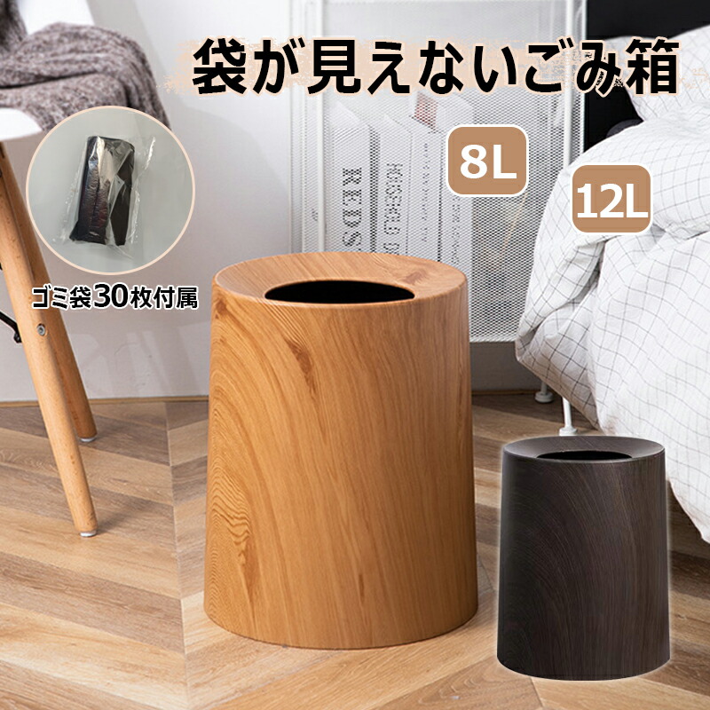 ゴミ箱 木目 ゴミ袋が見えない 30枚ゴミ袋付属 フタなしごみ箱 ごみばこ 蓋なしダストボックス 2重構造 円型 おしゃれ ダストBOX キッチン 洗面所 オフィス用 リビング