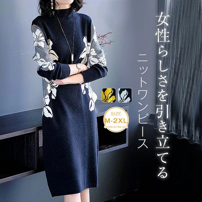 大き シンプル 膝丈 カジュアル セーター ニットセーター カットソー 長袖 花柄 ハイネック ニット 秋冬 レディース ワンピース