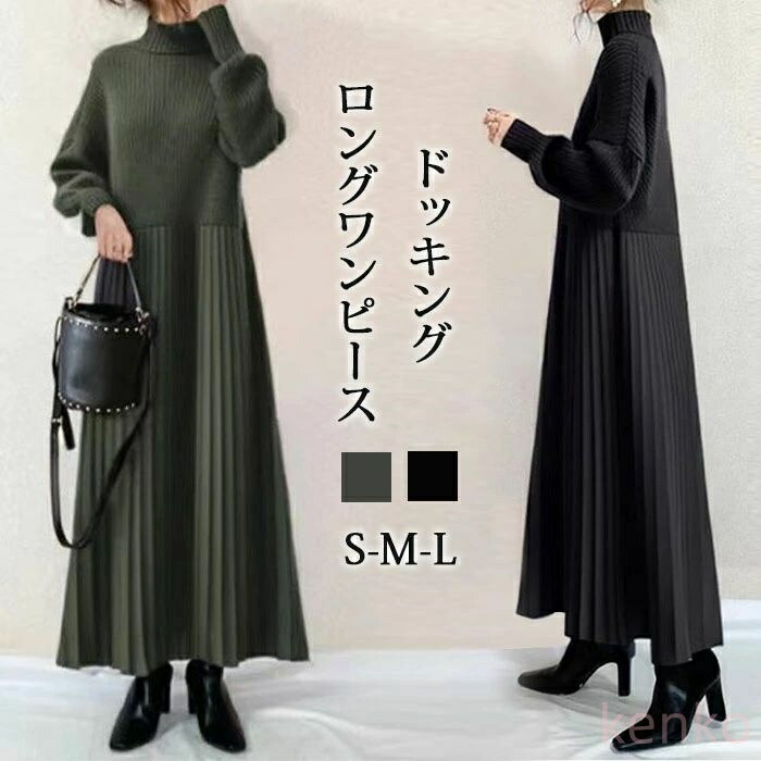 ニットロングワンピース 長袖 春秋 秋冬 ドッキングワンピース Aライン ハイネック レディース きれいめ 大きいサイズ マキシワンピース