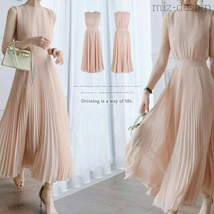 フェミニン 春 ノースリーブ ピンク きれいめ プリーツ エレガント ワンピース レディース 夏 ロングワンピース Aライ シフォン