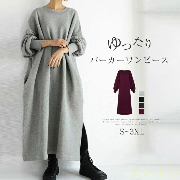 パーカー ワンピース レディース 春秋 スウェット トレーナー パーカーワンピース ロングワンピース ロング ロングパーカー 長袖 無地 クルーネック 丸首 オーバーサイズ ゆったり 体 プルオーバー