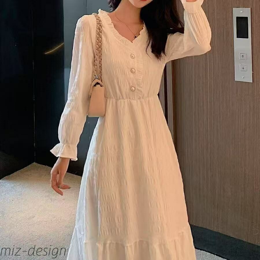 ワンピース ドレス 袖あり レディース エレガント きれいめ カジュアル ミモレ丈 長袖 仙女風 可愛い 透明感 ハイウエスト 大人
