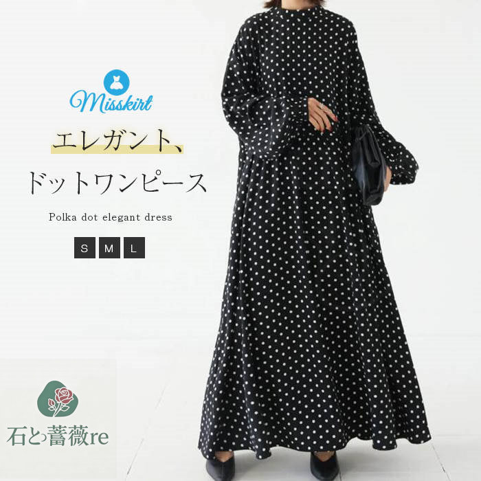 ワンピース レディース 新作 ドット柄 水玉 長袖 プルオーバー ロングワンピース ゆるっとワンピース ロング ワンピ 春 夏 秋 体型カバー 着痩せ ゆったり エレガント レトロ かわいい Aライン