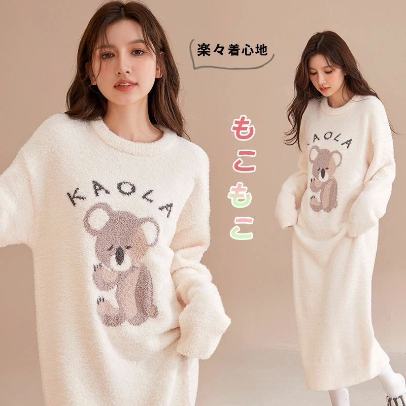 もこもこ ニットワンピース ルームウェア レディース 女子高生 パジャマ 部屋着 ロング丈ワンピース コアラ柄 シャギーニット 長袖 マキシ丈 動物 モコモコ 大人用 寝巻き 修学旅行 学園祭 厚手