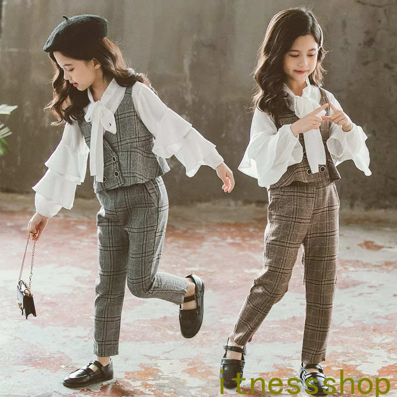 新生活 子供スーツ 女の子 フォーマル パンツスーツ セットベズト シャツ ズボン チェック柄 子供服 ジュニア 入園式 入学式 卒園式 卒業式 結婚式 発表会 七五三 ジャケット 3点セット 演奏会