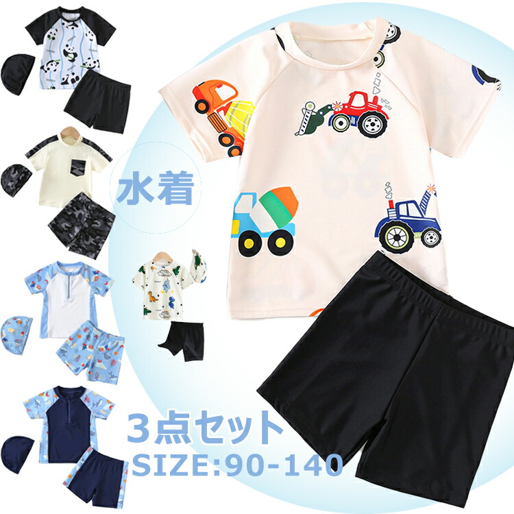 3点セット ベビー 水着 男の子 みずぎ 魚柄 半袖 パンダ柄 車柄 海底世界 恐竜 半ズボン 上下セット セットアップ 幼稚園 小学生 キッズ水着 ジュニア スクール水着 スイムウェア スイミ 子供