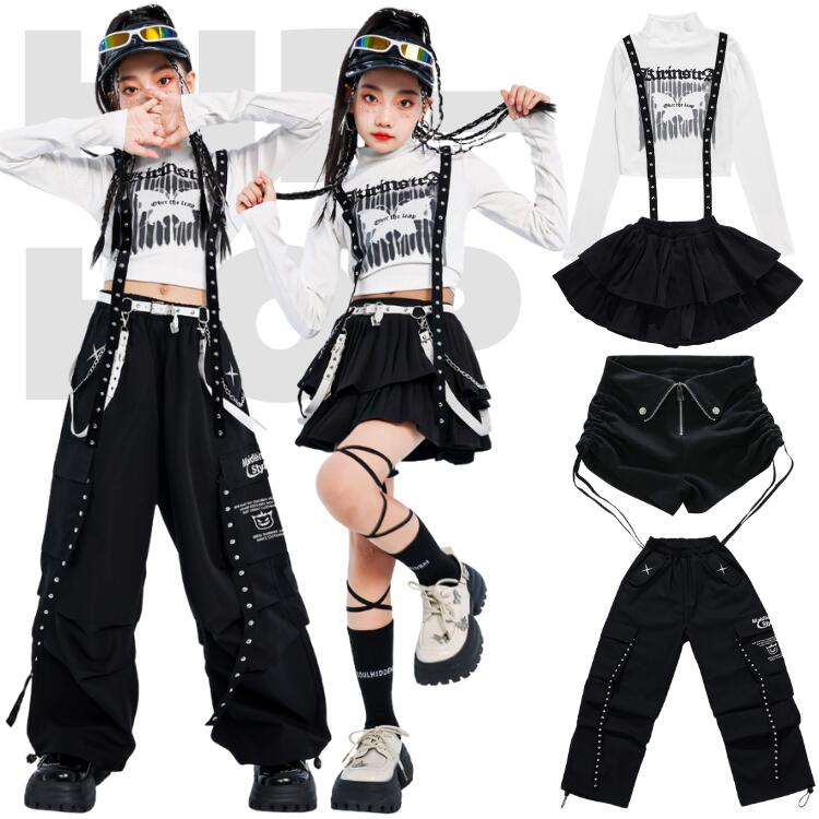 韓国 白 黒 キッズダンス衣装 女の子 ジャズ チア ヘソ出し ダンス衣装 セットアップ スカート カーゴパンツ トップス 長袖 子供服 ヒップホップ ファッション k-pop 衣装 jazz キッズ