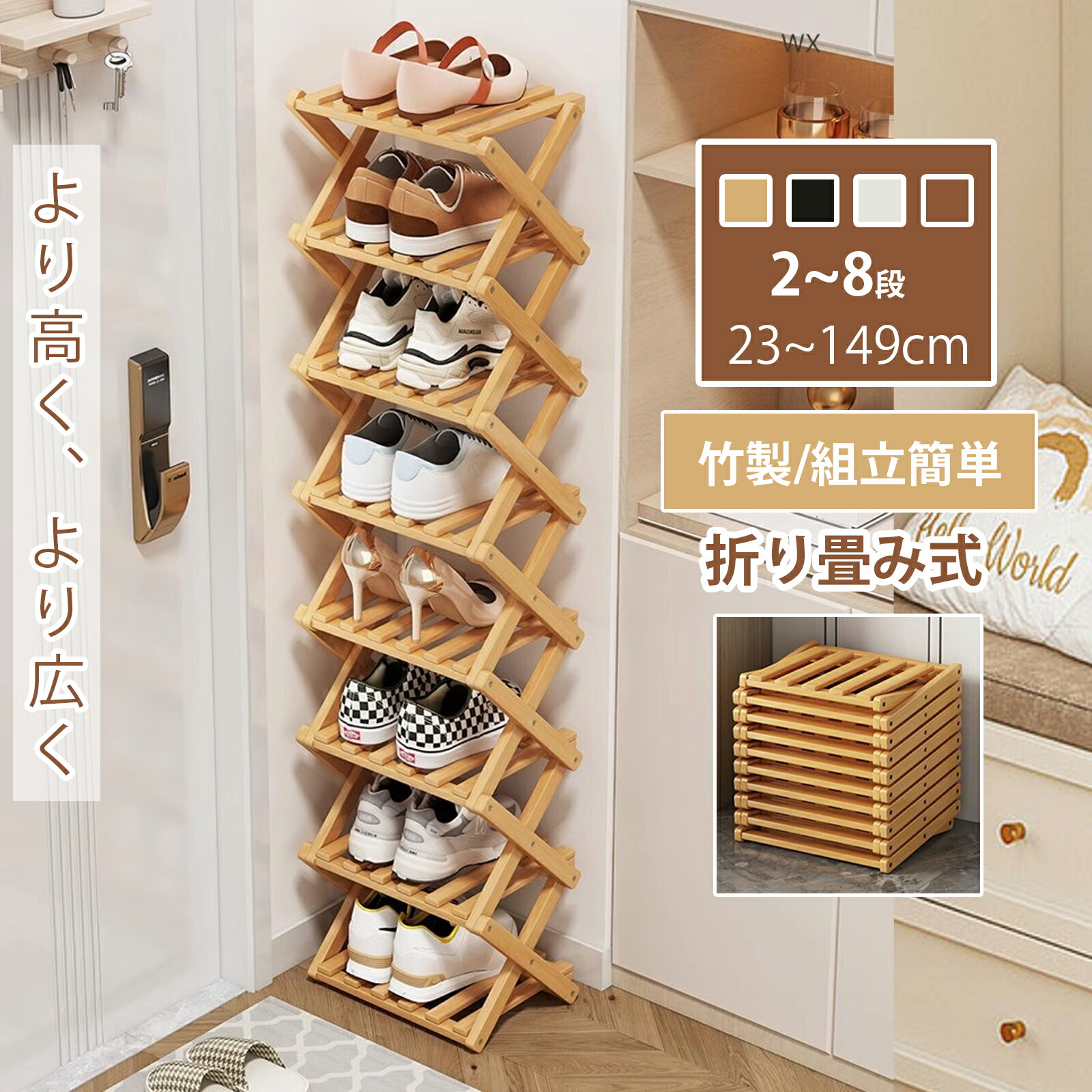 100円OFFクーポン シューズラック スリム 靴箱 組立不要 シューズボックス 省 スペース 靴棚 下駄箱 靴 収納 完成品 玄関収納 下足箱 折畳式 ラック 竹製 8段 伸縮 シュ コンパクト