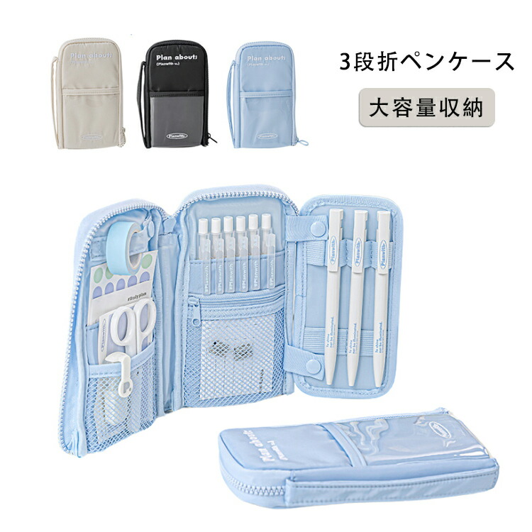 ペンケース 3段折 学生 ペンポーチ 可愛い ブルー 黒 大容量 ふで箱 おしゃれ 筆記用具 便利 ふでばこ 女の子 男の子 ユニセックス 入学 新入学 入学祝い 入園