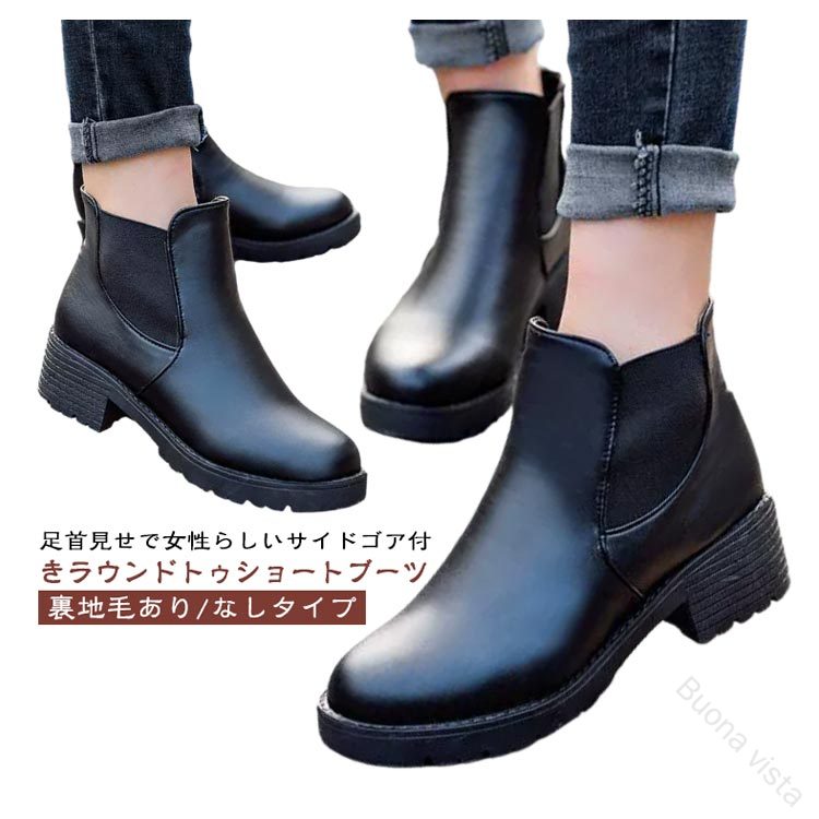 秋冬用ヒール4.5cmショートブーツ レディース 裏地毛ありなしタイプ ローヒールあたたか防寒 PUレザー裏起毛サイドゴアブーツ 歩きやすく美脚脚長で履きやすいシンプルデザイン 厚底ブーティ