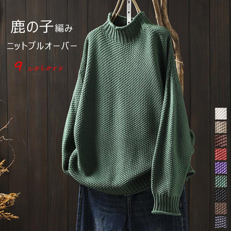 鹿の子編みハイネックニット ニットプルオーバー ニットセーター 長袖セーたー 鹿のこプルオーバー 厚手 お洒落 着回し