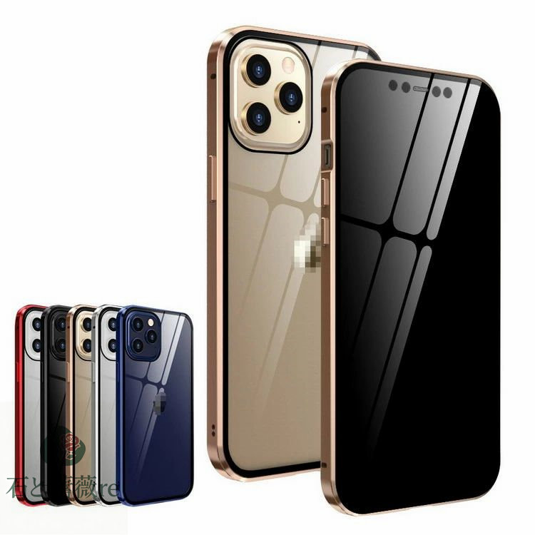 iPhone12 12 mini Pro Max ケース カバー アルミ バンパー クリア 透明 両面 前後 ガラス 背面パネル付き 覗き見防止 アルミサイ マグネット