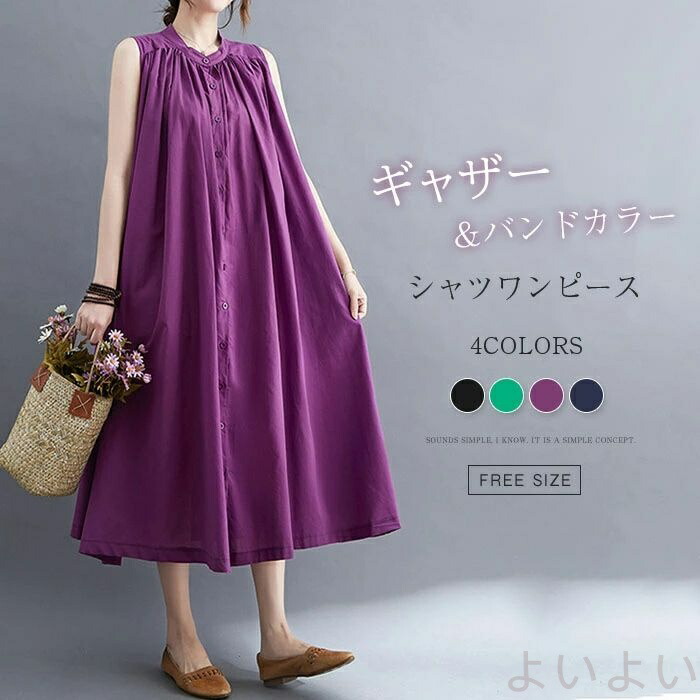ワンピース レディース シャツワンピース ノースリーブ ロングワンピース フレアワンピース 夏 ロング バンドカラー ギャザー ゆったり aラインワンピース