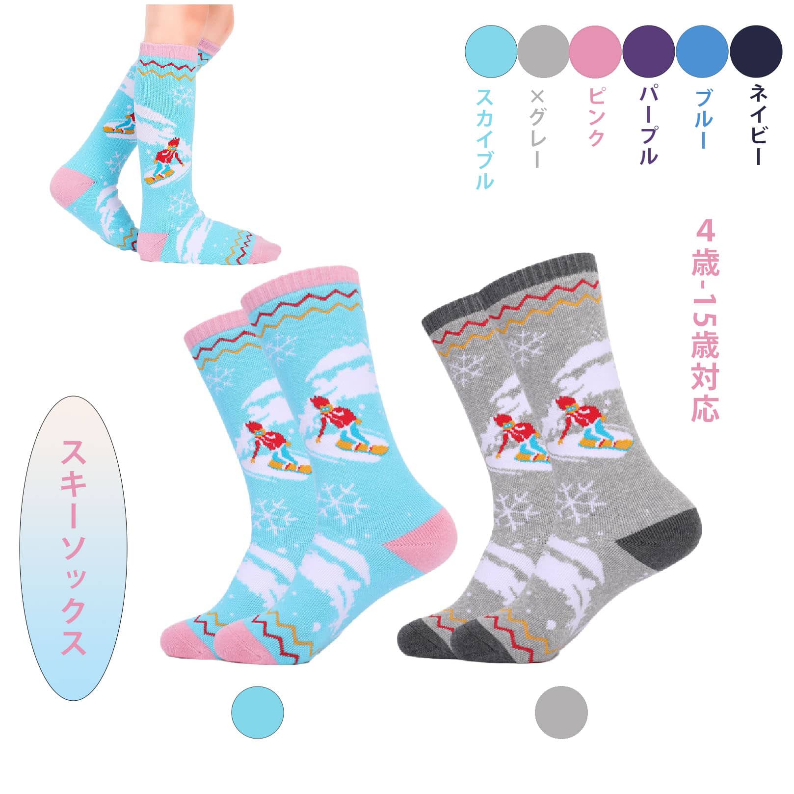 スキーソックス キッズ 子供スノーボードソックス 2足組 スキー靴下 子供用 ジュニア 厚手 ハイソックス 女の子 防寒 4歳-15歳対応 男の子