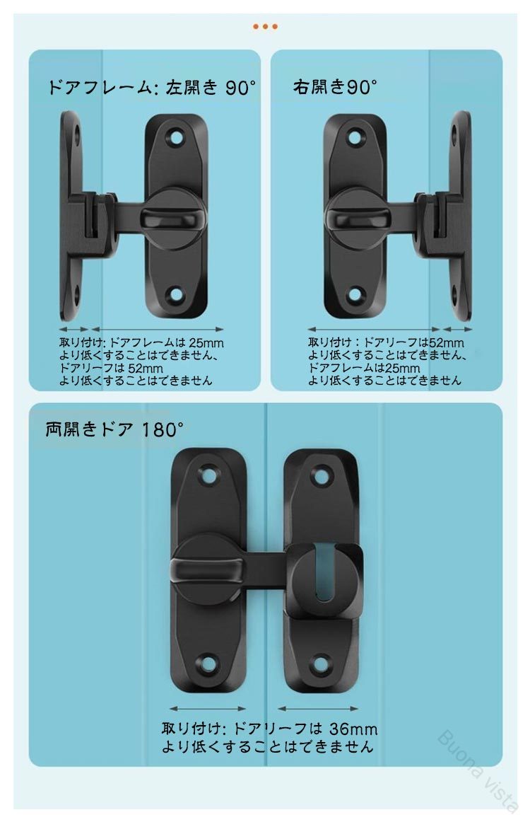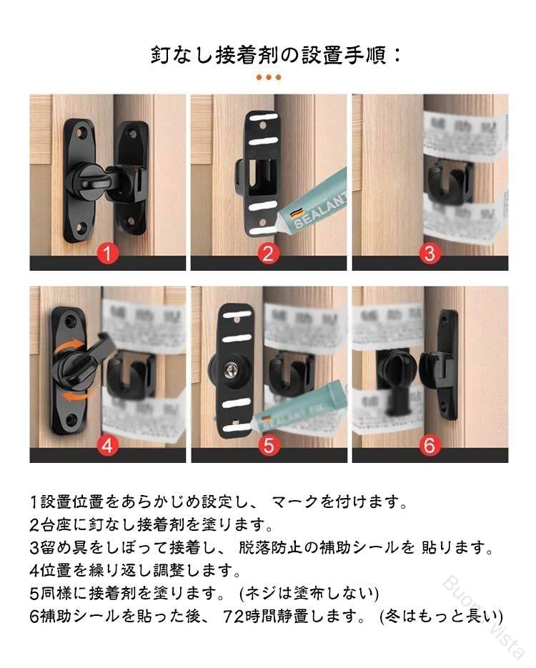 【高品質素材】高品質な亜鉛合金のドアバックルは、多層研磨仕上げで構成され、厚くて強化されたベース、強度が高く、腐食、錆や変色の心配はありません。簡単に壊れたり変形したりせず、耐久性に優れています。4球軸受構造を採用し、スムーズに回転でき、ワンタッチに簡単に開閉できます。【便利でシンプル】便利なフリップデザイン、プライバシーロック、フラップは、より快適な生活環境のためにさらなるセキュリティを提供します。【取付けも簡単】取り付け用のネジが付属しているため、留め具をすぐに設置する事ができます。左または右にインストールすることを選択できます。特殊タイプで90度の角度で取り付けられるため、ドアや窓の安全を確保するために使用できます。【安全保護】子供ケガ防止だけでなく、部屋の外に出ていかないようにしたり、様々な危険を防止できます。簡単施錠でスライドドアの防犯対策ができます。猫の脱走防止用としてもお使いいただけます。ネジの設置手順1設置位置をあらかじめ設定し、 マークを付けます。2記号に従ってネジを締めます。3距離を左右に調整し、 写真のように端に寄せます。4位置を繰り返し調整します。5同じように穴の位置を合わせ、 ネジを締めて固定します。6使用しないときは、写真のように垂直に吊るしてください。釘なし接着剤の設置手順:1設置位置をあらかじめ設定し、 マークを付けます。2台座に釘なし接着剤を塗ります。3留め具をしぼって接着し、 脱落防止の補助シールを 貼ります。4位置を繰り返し調整します。5同様に接着剤を塗ります。 (ネジは塗布しない)6補助シールを貼った後、 72時間静置します。 (冬はもっと長い)