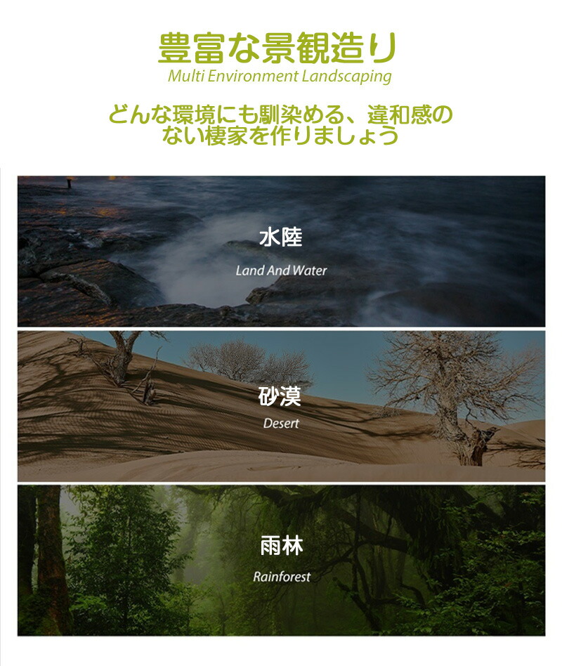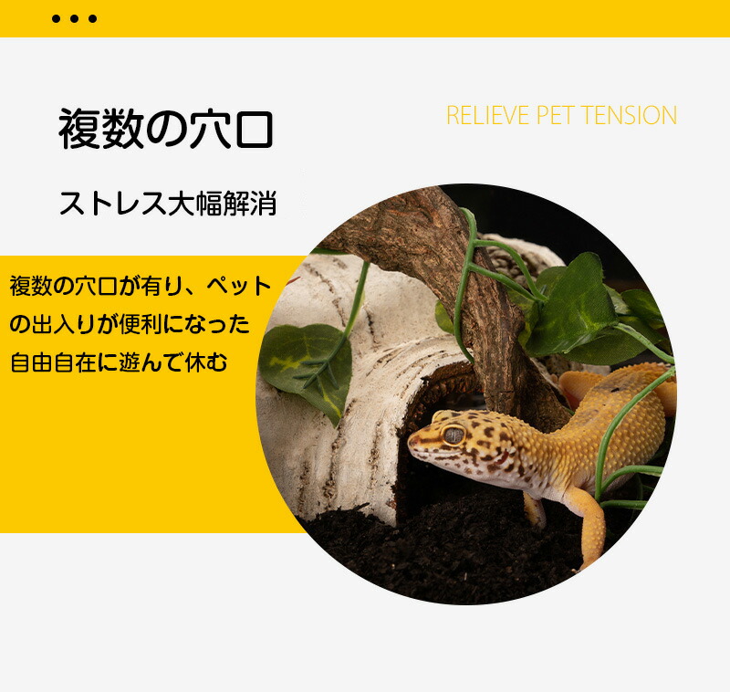 シェルター 白樺シェルターは、トカゲや亀、両生類、魚、爬虫類、昆虫などの生き物に最適な隠れ家を提供します。自然な白樺のデザインが景観を美しく演出し、ペットのストレスを軽減します。バスキングスポットとしても利用でき、シミュレーション環境を整えることで、ペットの健康をサポートします。汎用性が高く、さまざまな生き物の棲家として活躍します。