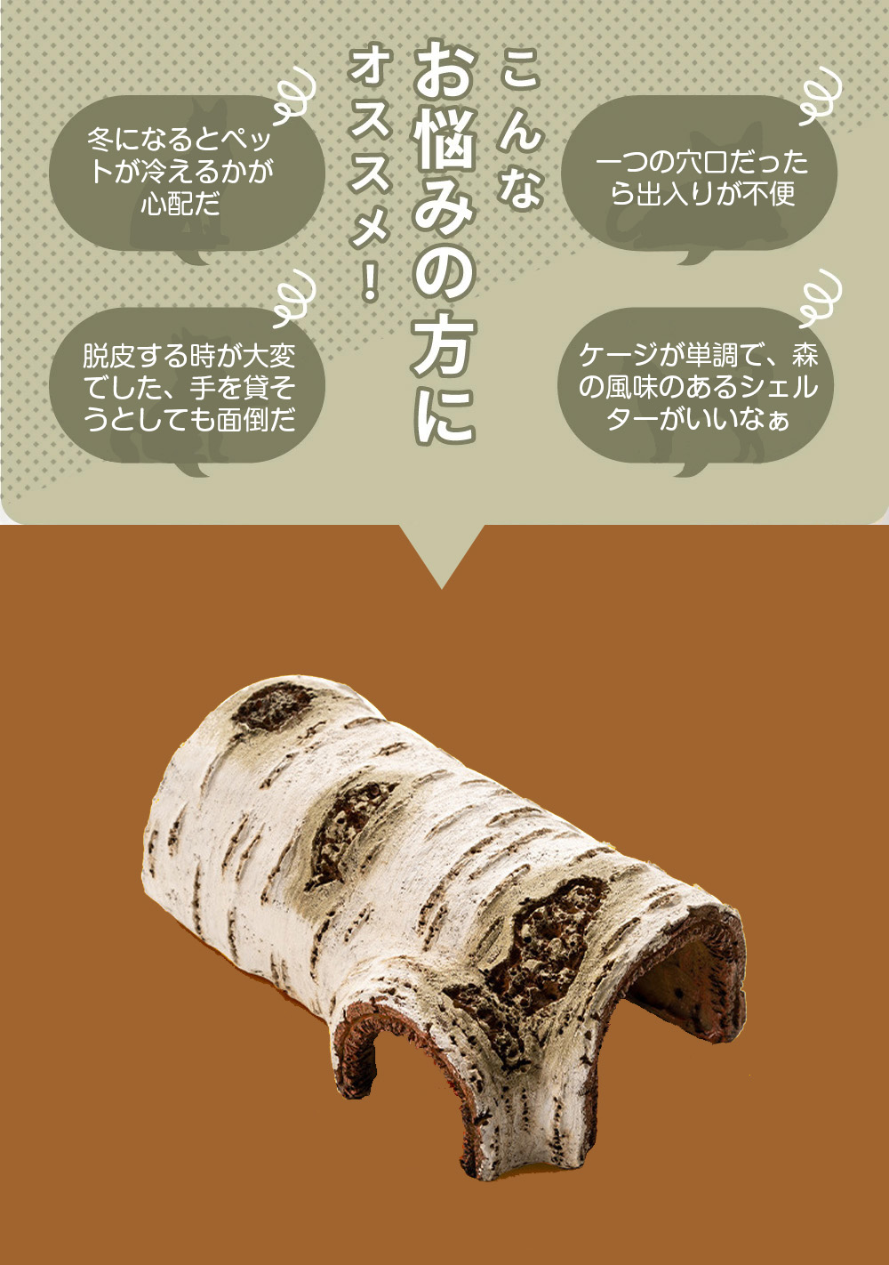 シェルター 白樺シェルター 隠れ家 バスキングスポット 白樺 棲家 トカゲ 亀 両生類 魚 爬虫類 昆虫 虫 守宮 ストレス解消 シミュレーション 汎用 景観造り