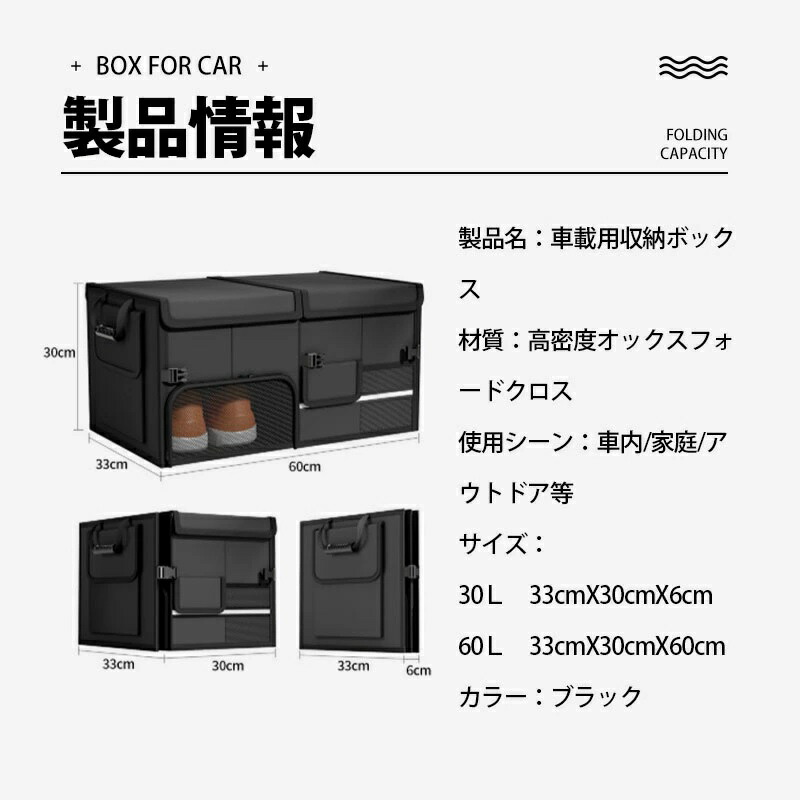 車用収納ボックス トランクボックス 収納ケース 折りたたみ ふた付き 大容量 仕切り 30L 60L 撥水 防水 耐摩耗 お手入れ簡単 車載バッグ ラゲッジ収納 トランク収納 小物整理 工具収納 洗車用品 非常用品 シューズ収納 靴収納 食品収納 アウトドア キャンプ ピクニック 取っ手付き 面ファスナー すべり止め 反射 ステッカー 反射材 視認性 吊り手 省スペース コンパクト 収納 折り畳み 片付け 整理 整頓 軽自動車 セダン ワゴン ミニバン SUV トラック ハッチバック 車中泊 ドライブ 旅行 帰省 レジャー カー用品 車用品 便利グッズ 収納グッズ ラゲッジ ルーフなし 後部収納 荷室 置き型 仕切り板 取り外し 分割 多機能 使い勝手 使いやすい スタイリッシュ ブラック 黒 男前インテリア 車内インテリア シンプル かっこいい おしゃれ ギア ボックス ケース 防汚 防滴 防塵 丈夫 長持ち 自立型 折りたたみ収納 フラット収納 スペース活用 荷崩れ防止 目隠しカバー ふた付きボックス 収納力 収まりが良い 安定感 走行中ズレ防止 滑り止めテープ 車体固定 プレゼント ギフト 贈り物 父の日 母の日 敬老の日 誕生日 クリスマス 新生活 一人暮らし ファミリー 人気 おすすめ 2025年