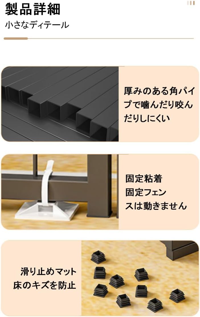 【形を自由にレイアウト立派な拡張性】 本ペットフェンスは、6枚個別の60幅のメタルパネルを組み合わせて構成されます。 幼犬、小型のペット、 ハムスター、うさぎ、モルモット、フェレットなどの小動物に最適です。 成長途中のワンちゃんを飼育している方や、将来的に数が増える予定なら、拡張性に優れているものが便利です。ペットフェンス自体の形を変えたり、別売りのパーツを追加して拡張できるものなら、ワンちゃんの活動スペースを広げることができ、お部屋の広さにも合わせやすいですよ。
