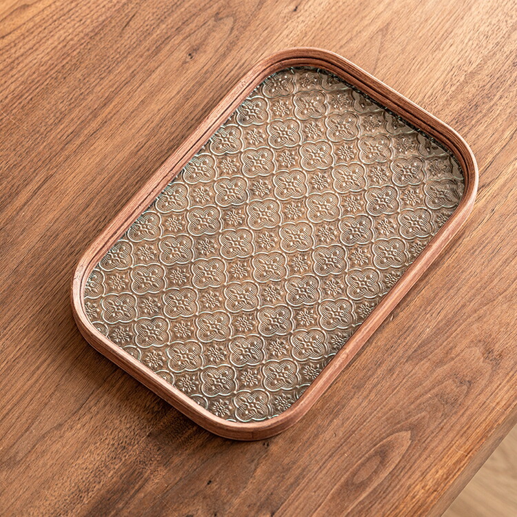 高評価&リピーター多数 フローラガラス トレー 盛器 ガラス トレイ 丸長角皿 30cm 35cm 透明 お皿 プレート 木 カフェトレー ティートレー ガラス皿 花海棠柄 木枠オリエ カフェプレート