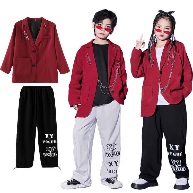 キッズダンス衣装 セットアップ ヒップホップ スーツ jazz モノトーン ブレザー パーカー 男の子 女の子 フォーマル k-pop ジャケット ワインレッド 赤 長袖 黒 白 オーバーサイ ベスト