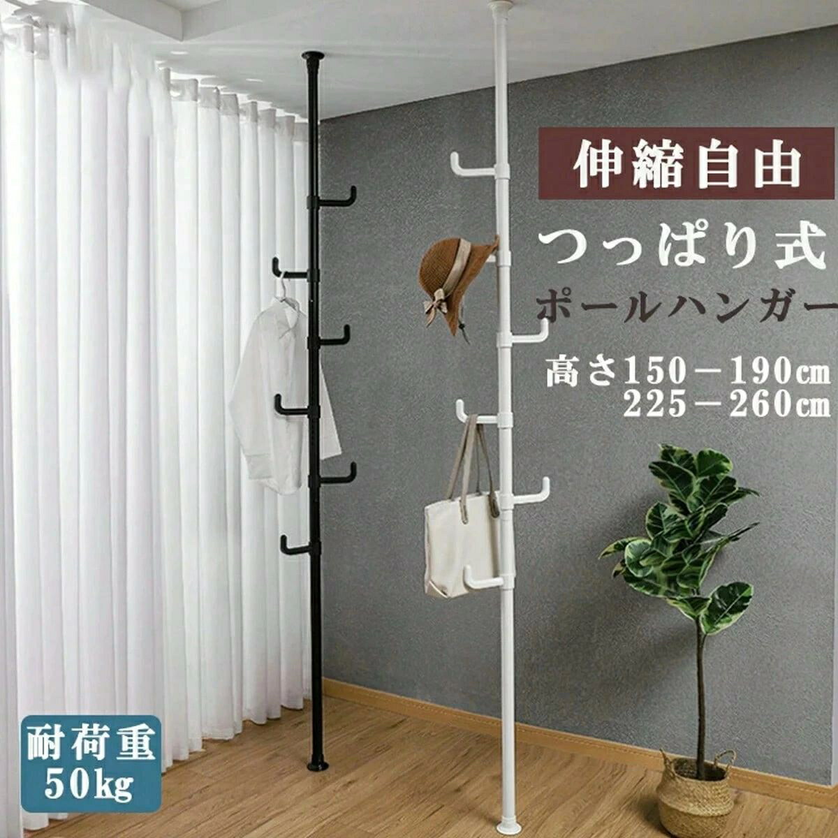 伸縮式 つっぱりポールハンガー コートハンガー 室内物干し ラック ハンガースタンド 突っ張り棒 高さ調節可能 省スペース ホワイト ブラック 収納ラック 360°回転フック