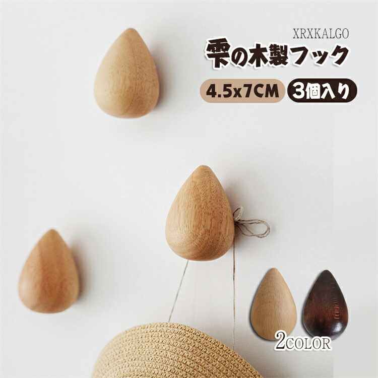 木製フック 取って 3個入り しずく 雫 ネジ テープ ウォールフック 木目 ドアハンドル 耐荷重5kg 壁掛けフック 洋服掛け ウォールハンガー カバン 帽子掛け 装飾用壁フック 玄関 寝室 可愛い