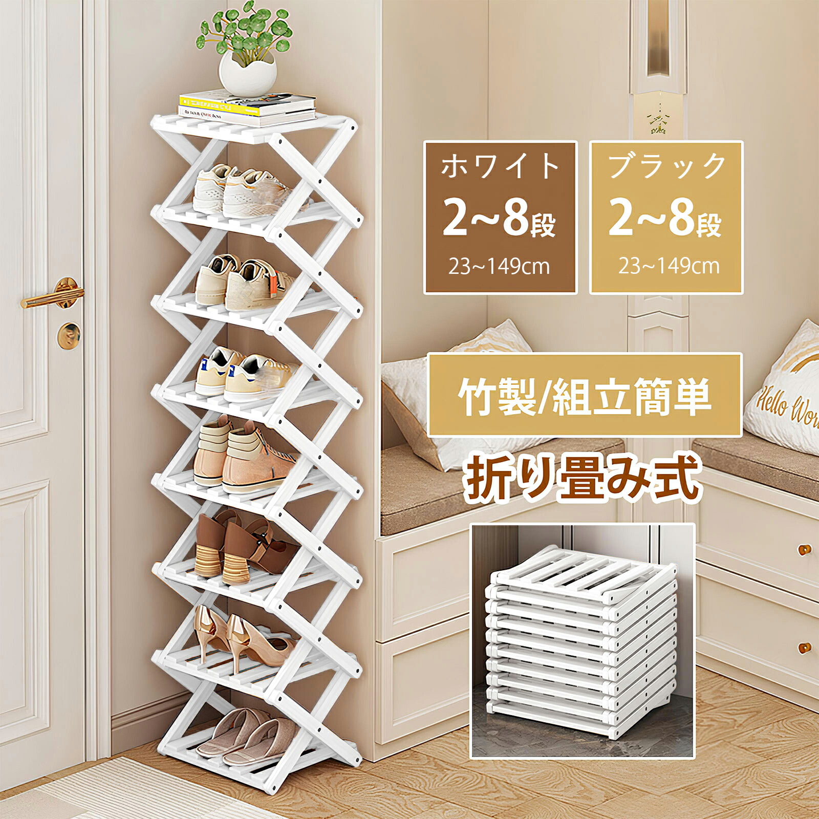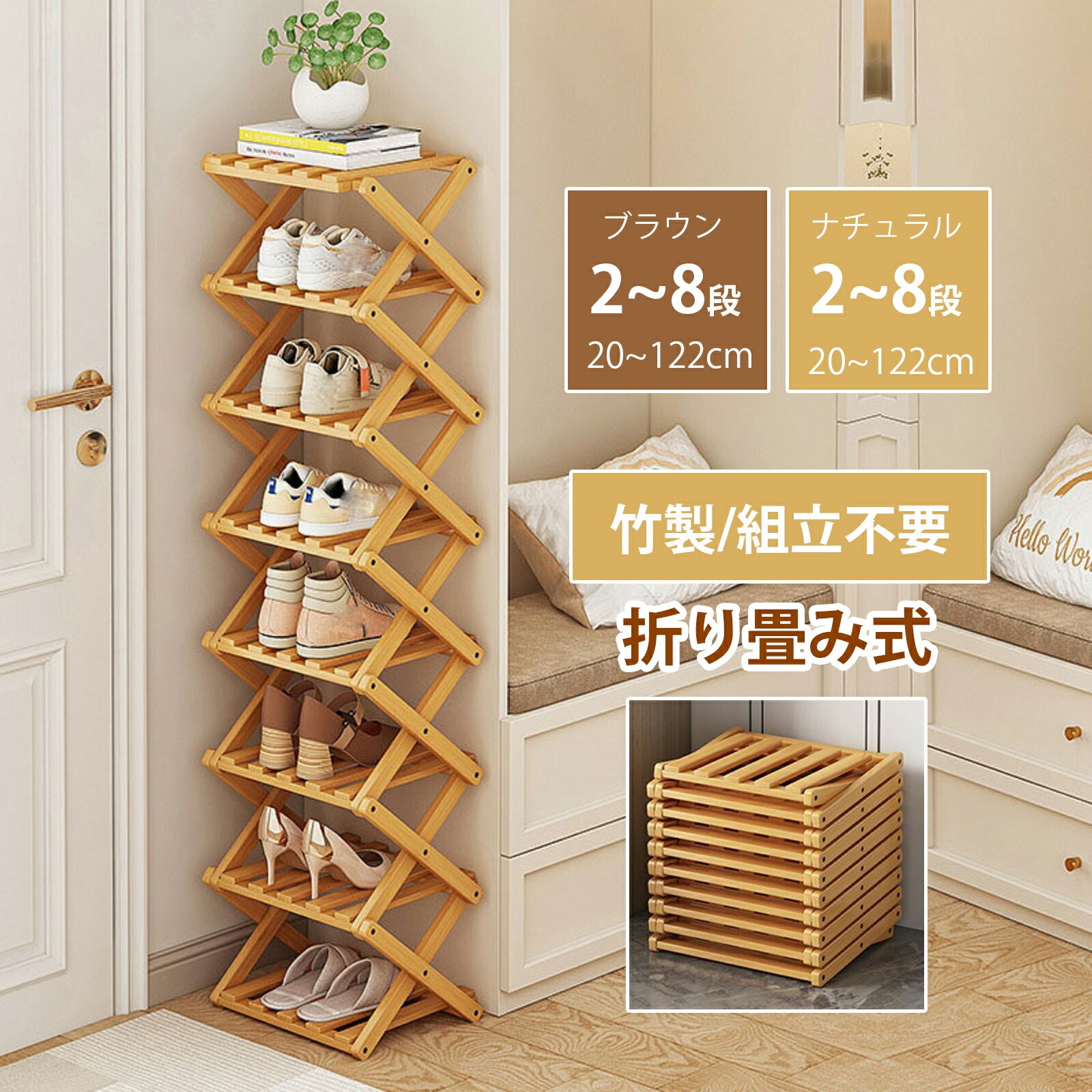 100円OFFクーポン シューズラック スリム 組立不要 靴箱 靴棚 下駄箱 靴 収納 シューズボックス 完成品 玄関収納 下足箱 折畳式 省 スペース ラック 竹製 8段 伸縮 シュ コンパクト